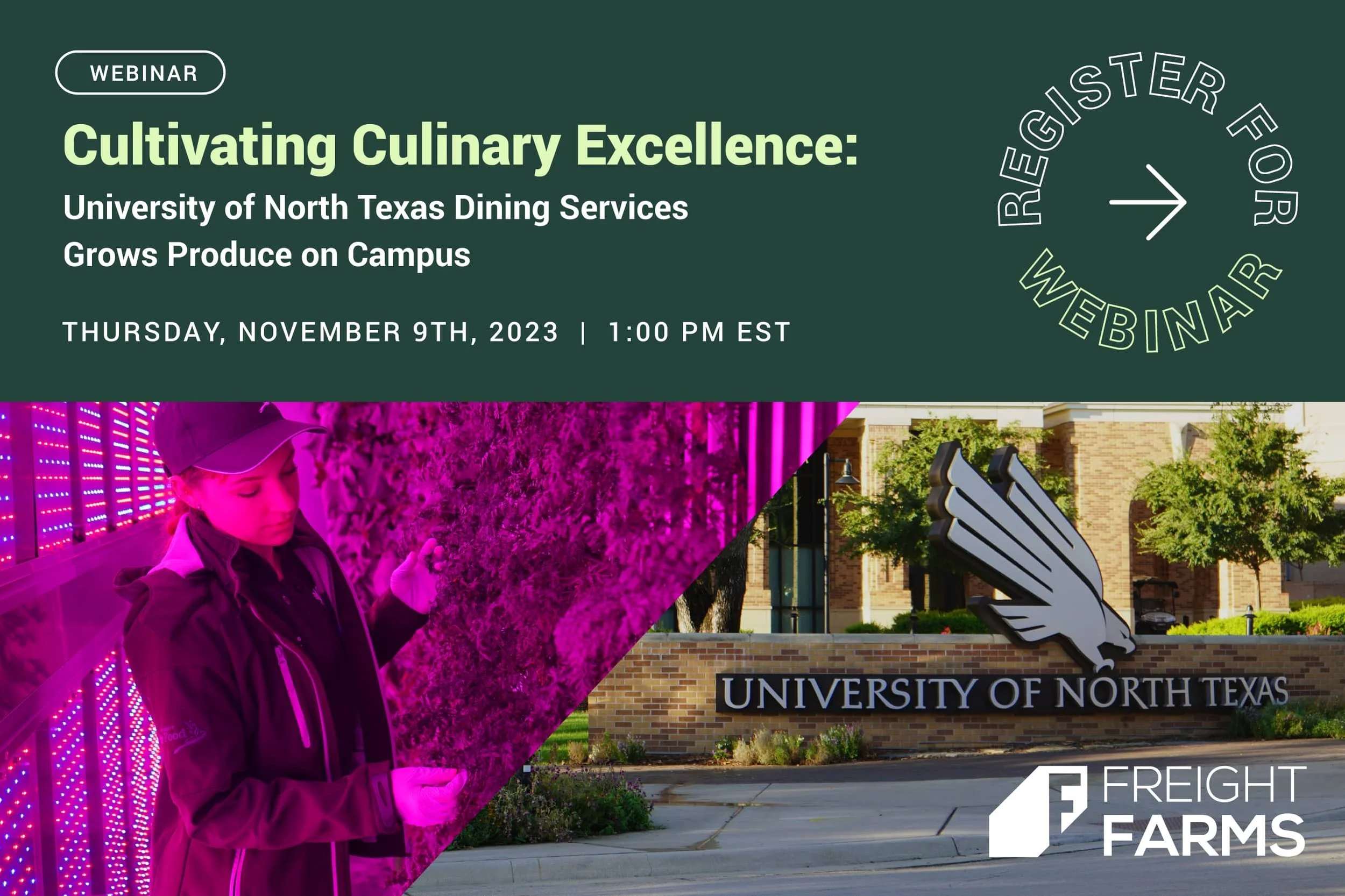 Revisit the webinar featuring Freight Farms and the University of North Texas. The session delved into topics of sustainable dining and culinary mastery, highlighting the University of North Texas' pioneering endeavor to cultivate fresh produce directly on their campus using two Freight Farms.